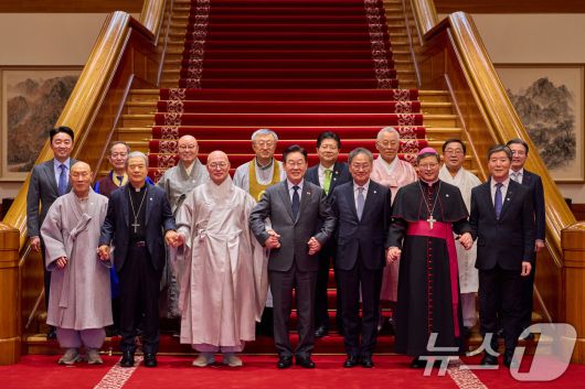 (서울=뉴스1) 이재명 기자 = 이재명 대통령이 12일 청와대에서 열린 종교지도자 초청 오찬 간담회에서 참석자들과 기념촬영을 하고 있다. (청와대 제공. 재판매 및 DB 금지) 2026.1.12/뉴스12expulsion@news1.krCopyright ⓒ 뉴스1. All rights reserved. 무단 전재 및 재배포, AI학습 이용 금지.