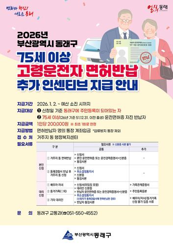 이번 사업의 지급 대상은 신청일 기준 부산 동래구에 주민등록이 돼있는 75세 이상 운전자로, 운전면허를 최초로 자진 반납하는 경우 20만 원의 인센티브를 지급한다. 해당 인센티브는 부산광역시에서 시행 중인 70세 이상 고령 운전자 운전면허 자진 반납 인센티브와는 별도로 지급된다.