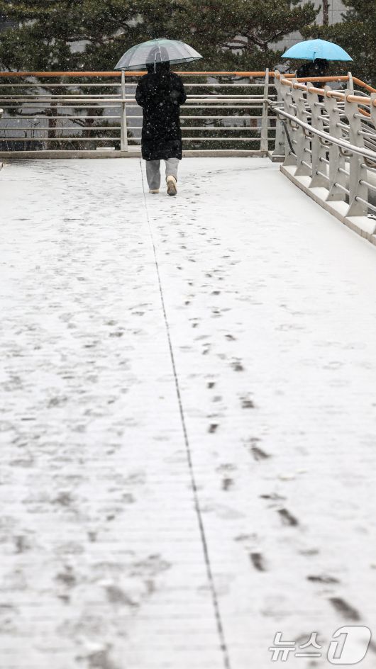 (서울=뉴스1) 이호윤 기자 = 눈이 내리는 12일 서울 마포구 인근 육교에 시민들이 우산을 쓰고 발걸음을 옮기고 있다. 2026.1.12/뉴스1256@news1.krCopyright ⓒ 뉴스1. All rights reserved. 무단 전재 및 재배포, AI학습 이용 금지.