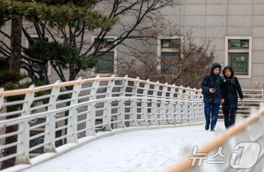 (서울=뉴스1) 이호윤 기자 = 눈이 내리는 12일 서울 마포구 인근 육교에서 외국인 관광객들이 발걸음을 옮기고 있다. 2026.1.12/뉴스1