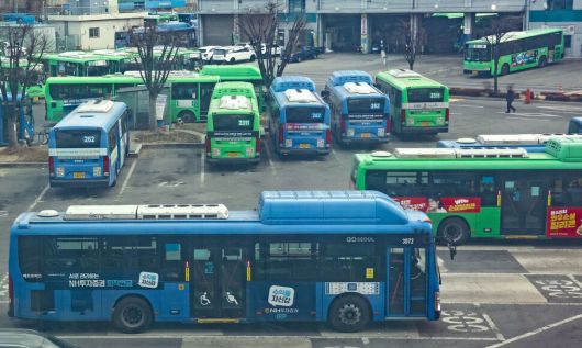 13일로 예고된 서울시 시내버스 파업을 하루 앞둔 12일 서울의 한 버스공영차고지에 서울 시내버스들이 주차되어 있다. 연합뉴스 |