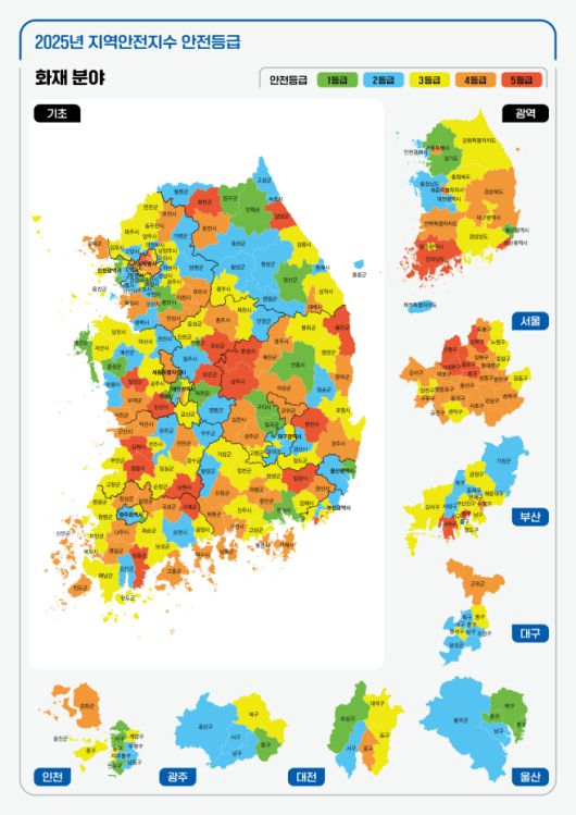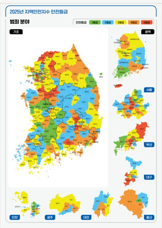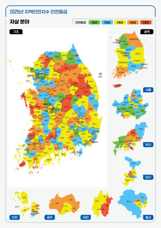 행정안전부는 12일 이같은 내용의 2024년 통계를 토대로 '2025년 시·도 및 시·군·구별 지역안전지수'를 공표했다. 지역안전지수는 교통사고, 화재, 범죄, 생활안전, 자살, 감염병 등 6개 분야의 사망 통계를 바탕으로 지역별 안전 수준을 상대평가한 지표다.