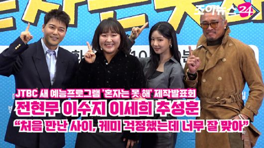 방송인 전현무, 이종격투기 선수 추성훈, 코미디언 이수지, 배우 이세희가 12일 오후 서울 마포구 스탠포드호텔에서 열린 JTBC 새 예능프로그램 '혼자는 못 해' 제작발표회에 참석해 소감을 말하고 있다. [영상=문수지 기자]