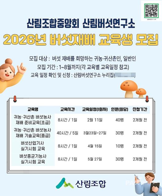 [사진제공=산림조합중앙회][대전=팍스경제TV] 산림조합중앙회 임산물유통본부 산림버섯연구소는 '2026년도 버섯재배 교육'을 수강할 교육생을 모집한다고 오늘(12일) 밝혔습니다.