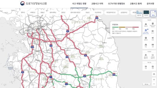 중부지방을 중심으로 비와 눈이 섞여 내리는 궂은 날씨가 이어지는 가운데, 12일 오후 5시40분 기준 기상청 도로기상정보시스템의 ‘도로 살얼음 발생 가능 정보’ 지도에는 위험을 알리는 붉은색 구간이 선명하게 나타났다. 위험 신호는 경부선, 영동선, 서해안선, 호남선 등 국내 주요 고속도로 곳곳을 가로지르며 운전자들의 주의를 요구한다.