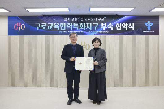 [헤럴드경제=박종일 선임기자]구로구(구청장 장인홍)가 1월 12일 구청 소통홀에서 서울특별시남부교육지원청과 ‘구로교육협력특화지구 부속 합의 협약식’을 열고 학생맞춤통합지원 협력사업을 포함한 구로교육특화지구 교육협력 사업 추진을 위한 부속합의를 체결했다.