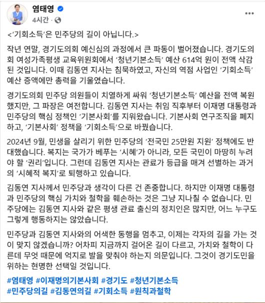 염 의원은 12일 사회관계망서비스(SNS)에 “‘기회소득’은 민주당의 길이 아니다”라는 제목의 글을 올리고, 김 지사의 대표 정책인 기회소득을 정면 비판했다. 문제제기의 출발점은 청년기본소득이었다. 염 의원은 지난해 말 경기도의회 예산심의 과정에서 청년기본소득 예산 614억원이 전액 삭감됐을 당시를 언급하며, “김 지사는 침묵했고 자신의 역점 사업인 기회소득 예산 증액에만 총력을 기울였다”고 지적했다.