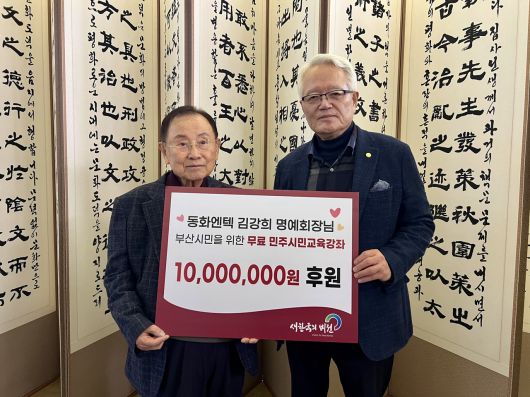 [헤럴드경제(부산)=이주현 기자] 성숙한 민주주의와 민주시민 양성에 기여해 온 ‘민주시민교육강좌’가 한 기업인의 후원으로 안정적인 운영 기반을 마련하게 됐다. 민주시민교육강좌를 주최하는 싱크탱크 ‘새한국의비전’은 김강희 동화엔텍 명예회장이 강좌의 취지에 공감해 후원금 1000만원을 기탁했다고 12일 밝혔다.