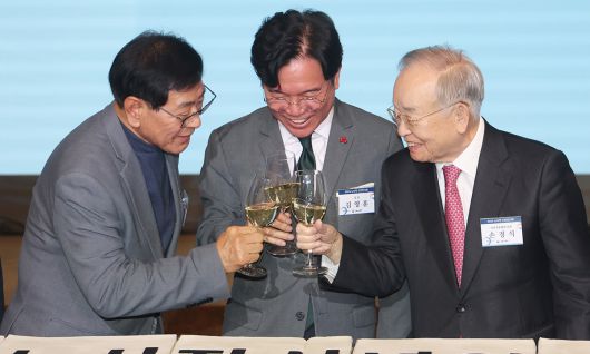 지난 8일 용산 피스앤파크컨벤션에서 열린 2026 노사정 신년인사회에서 서종수 한국노총 상임부위원장(왼쪽부터)과 김영훈 고용노동부 장관, 손경식 경총 회장이 건배를 하고 있다. 연합뉴스 |