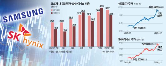 최근 증시 호황 속에서 삼성전자와 SK하이닉스가 차지하는 비중은 날로 확대되는 추세다. 이달 코스피 일평균 거래 대금은 24조 1050억 원으로 5년 만에 처음 20조 원을 넘었다. 다만 이달 5일에는 전체 거래 대금에서 삼성전자(우선주 포함)와 SK하이닉스가 차지하는 비중이 42.3%까지 확대됐다. 지난해 4월 18일 연저점(10.1%) 대비 4배 이상 늘어난 수치다. 시가총액 비중도 지난해 6월 16일 23.1%에서 이달 7일 38.8%까지 커졌다.