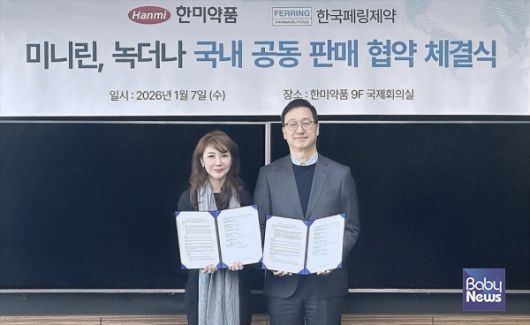 한미약품(대표 박재현)과 한국페링제약(대표 김민정)은 지난 7일 야간뇨·야뇨증 증상 치료제 '미니린정·미니린멜트설하정(성분명: 데스모프레신아세트산염, 이하 미니린)’ 및 야간뇨 증상 치료제 '녹더나설하정(성분명: 데스모프레신아세트산염, 이하 녹더나)’에 대한 공동 판매 계약을 체결했다고 12일 밝혔다.