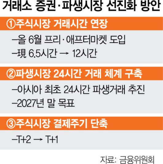 거래소는 현재 19시간(정규 시장 오전 8시 45분~오후 3시 45분, 야간 거래시간 오후 6시~다음날 오전 6시)인 파생상품시장 거래시간도 2027년 말을 목표로 24시간으로 연장할 계획이다. 이 경우 아시아 최초로 24시간 파생상품 거래가 가능한 증시가 된다. 선진시장 추세에 맞춰 주식시장 결제 주기도 ‘T+1’로 줄일 방침이다. 미국과 캐나다는 2024년 5월부터 ‘T+1’ 시행을 완료했고 영국과 유럽은 2027년 10월께 시행 예정이다.