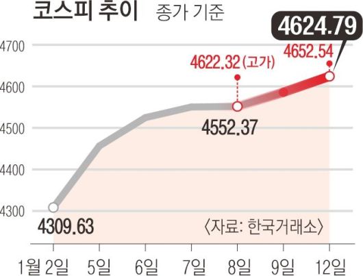 12일 한국거래소에 따르면 이날 코스피는 전 거래일 대비 38.47 포인트(0.84%) 오른 4624.79에 거래를 마쳤다. 지난 2일 이후 7거래일 연속 상승 마감으로, 종가 기준 사상 처음으로 4600선을 넘어섰다. 장 중 한때 4652.54까지 올라 지난 8일 세운 장중 최고가인 4622.32도 넘어섰다.