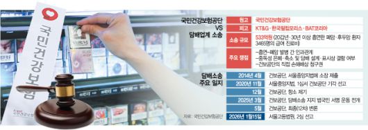 국민건강보험공단이 주요 담배회사들을 상대로 제기한 500억 원대 '담배소송'의 2심 선고가 15일 열린다. 2020년 11월 1심 재판부가 공단의 청구를 기각한 지 약 6년 만으로 건보공단이 소송을 처음 제기한 지는 12년 만이다. 공공기관이 직접 담배회사를 상대로 손해배상을 요구한 국내 첫 사례로, 담배 규제 정책의 향방이 달려 있다고도 볼 수 있어 재판부의 판단에 이목이 집중된다.