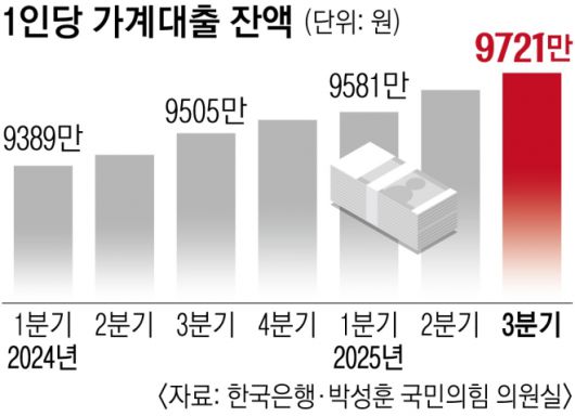 12일 한국은행이 국회 기획재정위원회 소속 박성훈 국민의힘 의원에게 제출한 자료에 따르면 지난해 3분기 말 기준 가계대출이 있는 차주가 보유한 1인당 평균 대출액은 9721만원이었다. 지난 2012년 관련 통계가 작성되고 가장 많은 수준으로, 지난 2023년 2분기 말(9332만원) 이후 9분기 연속 증가세를 이어가고 있다. 1년 전인 2024년 3분기 말(9505만원)보다도 200만원 넘게 늘었다.