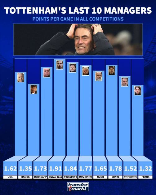 축구 통계 전문 매체 트란스퍼마르크트는 지난 10일(한국시간) "토트넘 역사상 지난 20년을 통틀어 프랑크 감독의 성적은 가장 낮은 수준"이라며 그의 재임기를 수치로 조명했다.