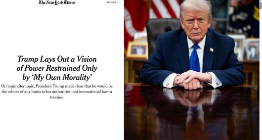 야음을 틈탄 기습 작전으로 마두로 대통령 경호원을 몰살하고 외국 정상 부부를 납치한 ‘전과’에 고무돼서인지 스스로를 신의 영역으로 올리는 트럼프의 발언은 미국의 베네수엘라 불법 침공에 못지 않게 충격적이다. 그래서인지 이번 사태를 트럼프라는 인물의 특수성에서 풀이하는 견해가 더 힘을 얻는다.