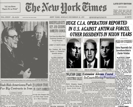 1974년 12월 22일 뉴욕타임스는 미 중앙정보국(CIA)이 반전단체 활동가와 언론인 등을 광범위하게 불법 사찰해왔다는 사실을 폭로했다. CIA 내 특수조직이 최소 10,000명 이상의 미국 시민을 도청, 미행해 개인 파일을 작성 관리한 불법 공작 전모가 최초로 드러났다. CIA의 국내 정보활동은 자체 헌장뿐만 아니라 법률과 헌법 위반이다.