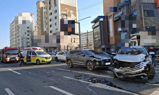 12일 오후 3시 5분쯤 경북 경주시 현곡면 금장사거리에서 싼타페 차량이 앞에서 신호 대기 중인 스포츠유틸리티차(SUV)를 추돌했다.