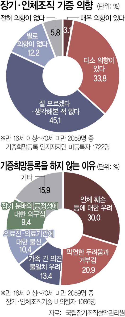 하지만 높은 인식과 달리 실제 행동으로 이어지는 참여도는 크게 떨어졌다. 장기·인체조직 기증에 대해 ‘매우 의향이 있다’고 답한 비율은 3.1%, ‘다소 의향이 있다’는 응답은 33.8%였다. ‘잘 모르겠다, 생각해본 적 없다’는 응답이 45.1%로 가장 많았고 ‘별로 의향이 없다(12.2%)’ ‘전혀 의향이 없다(5.8%)’는 응답도 적지 않았다. 특히 장기기증 제도를 알고 있는 설문조사 대상자들 중 실제 기증 희망 등록을 한 경우는 2.9%에 불과했다. 장기기증의 필요성에 공감하고 긍정적으로 인식하고 있지만 기증 희망 등록이라는 실제 행위로까지 이어지지 못하고 있는 것이다.