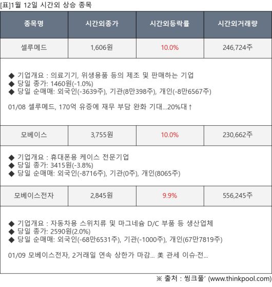 [서울=뉴스핌] 로보뉴스 = 1월 12일, 인공지능 투자비서 ‘AI라씨로’는 시간외 단일가 매매에서 크게 상승한 셀루메드(049180), 모베이스(101330) 등에 대해 최근 동향을 분석했다.