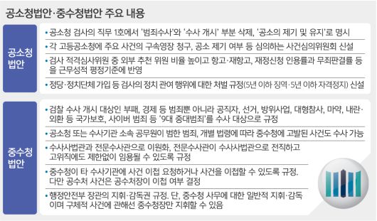 중수청은 공소청이나 다른 수사기관 소속 공무원이 저지른 범죄와 개별 법령에 따라 중수청에 고발된 사건도 수사할 수 있다. 법안에는 중수청이 수사를 개시하면 공소청 검사에 통보하도록 하되 수사의 공정성·효율성을 현저히 저해할 우려가 있는 등 경우에는 통보를 유예할 수 있다는 내용도 담겼다.