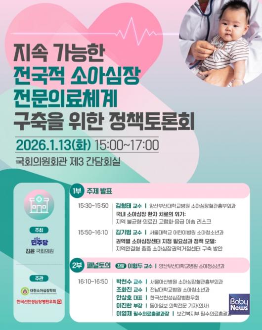 더불어민주당 김윤 의원(보건복지위원회, 비례대표)은 1월 13일(화) 오후 3시 국회의원회관 제3간담회실에서 대한소아심장학회·한국선천성심장병환우회와 함께 「지속가능한 전국적 소아심장 전문의료체계 구축을 위한 정책토론회」를 개최한다.
