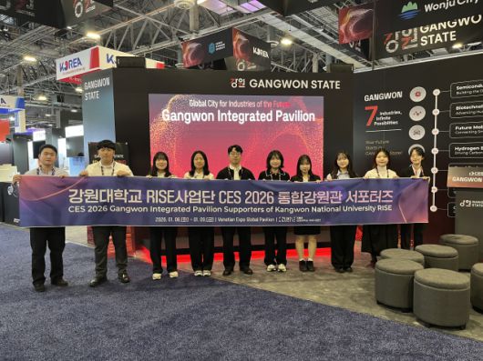 강원대학교(총장 정재연) RISE사업단(단장 이득찬 산학연구부총장)은 6~8일까지 미국 라스베이거스에서 열린 ‘CES 2026’에 ‘통합강원관 서포터즈’를 파견해 강원 지역 기업의 전시 지원 업무를 성공적으로 수행했다.