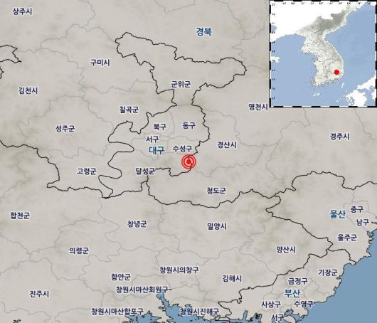 지진 발생위치.[기상청 제공] [헤럴드경제(대구)=김병진 기자]12일 오후 4시 51분 01초 대구 달성군 동쪽 22km 지역에서 규모 2.0의 지진이 발생했다. 이번 지진의 진앙은 북위 35.77도, 동경 128.68도이다. 지진 발생 깊이는 8km다. 기상청은 이번 지진으로 인한 피해는 없을 것으로 예상했다.