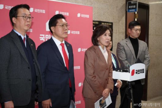 나경원 국민의힘 의원 등 국민의힘 법사위원들은 12일 오후 서울 여의도 국회에서 법사위 전체회의가 끝난 뒤 기자회견을 열고 "이 특검은 지방선거까지 내란정국을 이어가겠다는 목적으로 만들어진 것"이라며 "오히려 지금 해야 할 것은 민주당이 꽁꽁 숨긴 사건들 특검을 해야 할 때"라고 주장했다.