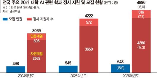 이러한 선호도 증가는 구체적인 수치로 증명된다. AI 관련 학과의 정시 지원자 수는 2024학년도 3069명에서 2025학년도 4222명, 그리고 올해 4896명으로 매년 폭발적으로 늘고 있다.