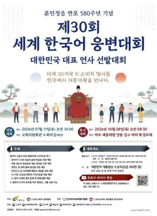 [이데일리 이정훈 기자] 훈민정음 반포 580주년을 기념해 전 세계 한국어 고수들이 실력을 겨루는 대규모 웅변대회가 열린다.