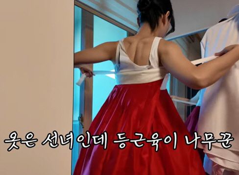 김다영은 직접 다린 한복을 착용하는 과정도 공개했는데, 탄탄한 등 근육이 드러난 뒤태가 놀라움을 자아냈다. 영상에는 '옷은 선녀인데 등근육이 나무꾼'이라는 자막이 더해져 웃음을 안겼다.