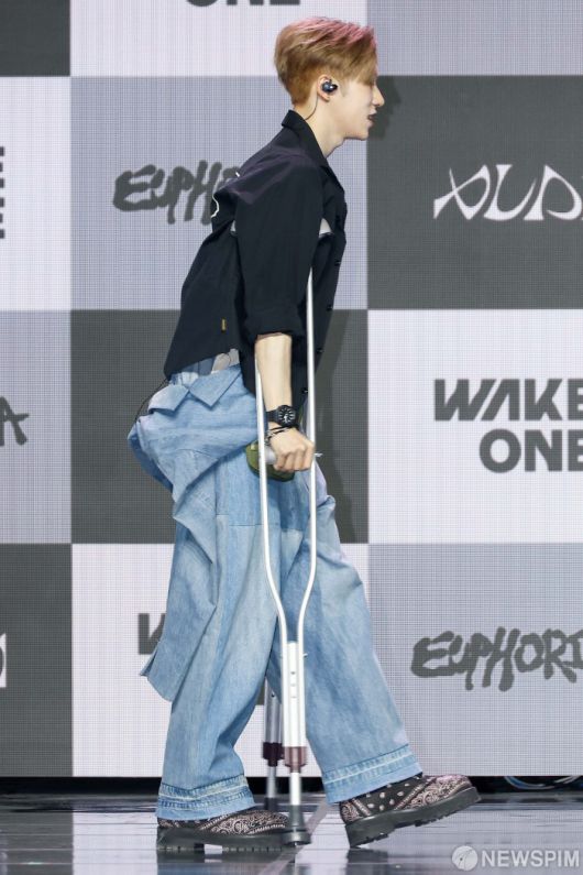 [서울=뉴스핌] 류기찬 기자 = 신인 보이그룹 알파드라이브원 멤버 아르노가 12일 오후 서울 용산구 블루스퀘어 SOL트래블홀에서 열린 데뷔 기념 쇼케이스에서 목발을 짚고 입장하고 있다. 2026.01.12 ryuchan0925@newspim.com