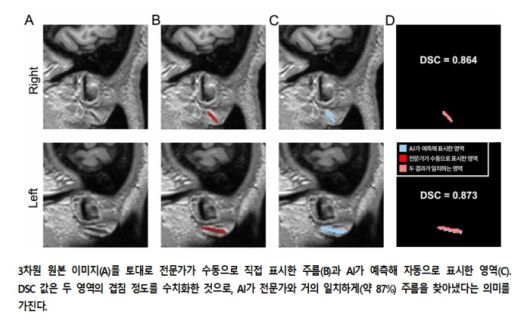 그 결과 전문가가 수동으로 표시한 영역과 AI가 자동으로 분할한 영역의 일치 정도를 측정하는 Dice 유사도 계수(DSC) 값이 두 차례 검증에서 각가 △0.734 △0.714로 나타났다. DSC 값은 1에 가까울수록 유사한 것이다.