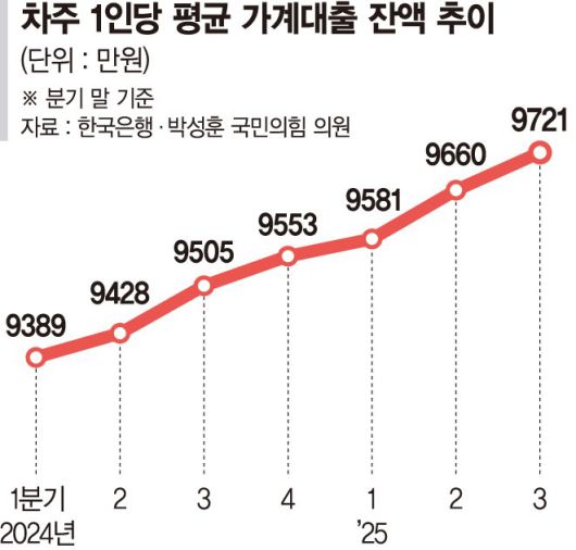 1인당 평균 대출잔액은 2023년 2·4분기 말 9332만원에서 9분기 연속 증가세를 이어왔다. 전년 동기인 2024년 3·4분기 말(9505만원)과 비교해도 200만원 이상 늘어 가계부채 부담이 지속적으로 확대되고 있음을 보여준다.