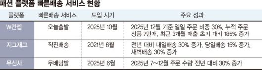 빠른배송이 성과로 이어지면서 패션 플랫폼들은 서비스 확대에 적극 나서는 분위기다. W컨셉은 오늘출발 서비스 대상 품목을 지속적으로 늘려 배송 경쟁력을 고도화할 방침이다. 지그재그도 배송 권역과 적용 상품군을 단계적으로 확대하며 빠른배송 서비스를 강화해 나갈 계획이다.