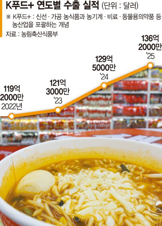 지난해 농식품 및 농산업 수출이 136억달러(약 19조8302억원)를 넘어섰다. 역대 최고 실적이다. 라면·소스류 등 가공식품과 농기계가 수출을 이끌었다. 미국과 중국으로의 수출 비중이 컸지만 유럽과 중동 수출 증가폭도 두드러졌다. 정부는 올해 160억달러를 목표로 할랄푸드 등 중동시장과 유망 품목을 겨냥한 수출 확대에 나설 계획이다.
