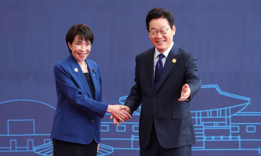 이재명 대통령이 2025년 10월 31일 경주화백컨벤션센터(HICO)에서 열린 2025 아시아태평양경제협력체(APEC) 정상회의에 참석한 다카이치 사나에 일본 총리를 맞이하고 있다. 연합뉴스 |