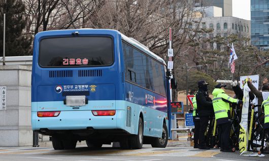 윤석열 전 대통령이 탑승한 호송차가 지난 12일 서울 서초구 서울중앙지방법원으로 들어서고 있다. 연합뉴스 |