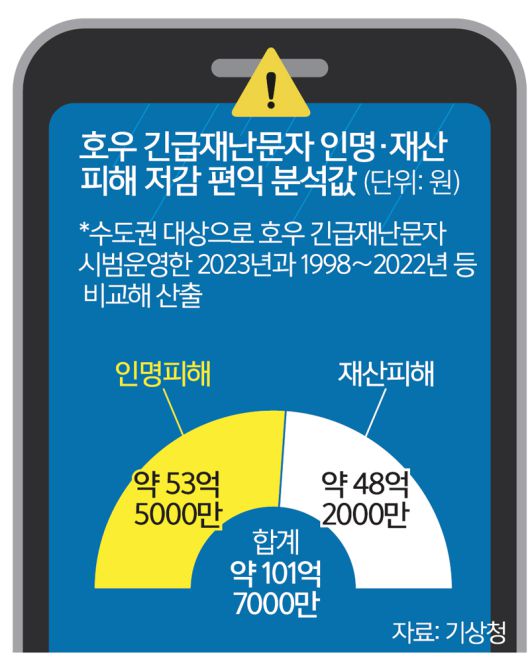 이는 기상청이 최초로 호우 긴급재난문자를 시범 운영한 2023년 수도권 인명·재산 피해를 기준으로 삼아, 같은 해 시범 운영하지 않은 다른 지역과 시범 운영 전인 1998∼2022년 등을 비교해 호우 긴급재난문자의 ‘순수 효과’를 산정한 값이다.