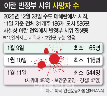 미국 기반 인권운동가통신(HRANA)에 따르면 이란 반정부 시위 사망자 수는 지난 9일 65명에서 이날 최소 544명으로 급증했다.