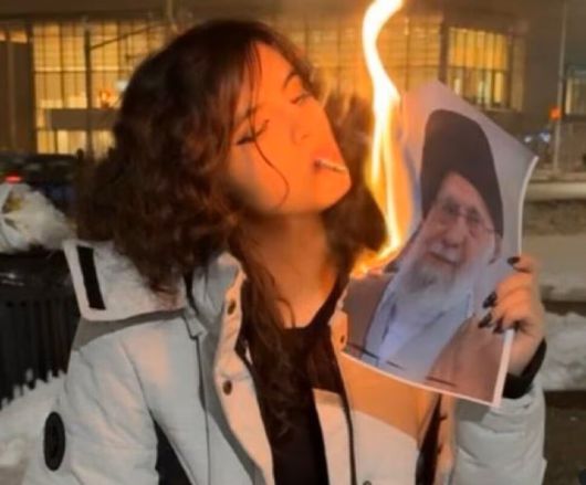 2022년 캐나다 토론토에서 촬영된 한 아랍계 여성이 하메네이의 초상에 불을 붙여 담배를 태우는 사진. 출처 엑스 |