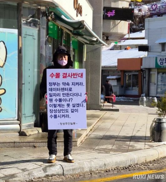강원 태백시 장성동 주민이 12일 장성광업소 수몰에 반대하는 1인 시위를 하고 있다. |