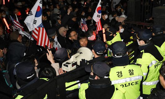 지난 2025년 1월 19일 내란 우두머리 혐의로 체포된 윤석열 대통령의 영장실질심사가 열린 18일 오후 서울 마포구 서울서부지방법원에서 경찰이 윤 대통령 지지자들과 대치하고 있다. 뉴스1 |