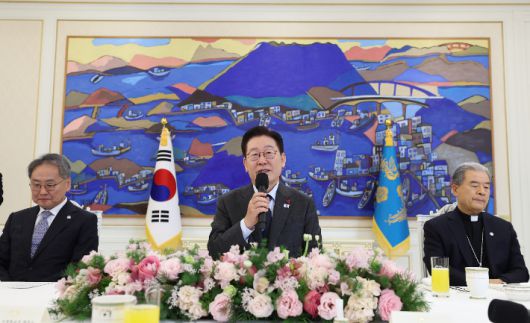 이재명 대통령이 12일 청와대에서 열린 종교지도자 초청 오찬간담회에서 발언하고 있다. 왼쪽부터 김정석 한국교회총연합 대표회장, 이재명 대통령, 이용훈 한국천주교주교회의 의장. 연합뉴스 |