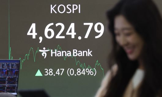 코스피가 전 거래일(4586.32)보다 38.47포인트(0.84%) 오른 4624.79에 마감한 12일 서울 중구 하나은행 딜링룸에 지수가 표시돼 있다. 뉴시스 |