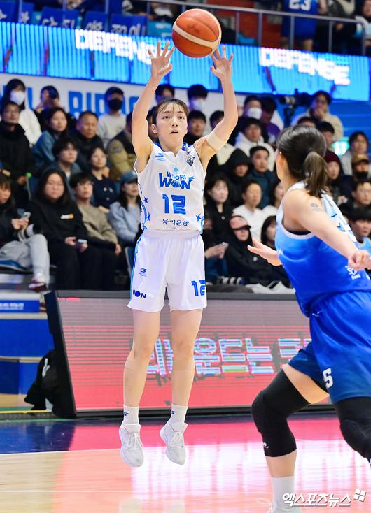 (엑스포츠뉴스 인천, 김한준 기자) 12일 오후 인천광역시 중구 도원체육관에서 열린 'BNK 금융 2025-2026 여자프로농구' 신한은행과 우리은행의 경기, 우리은행 아야노가 3점슛을 시도하고 있다.김한준 기자 kowel@xportsnews.com