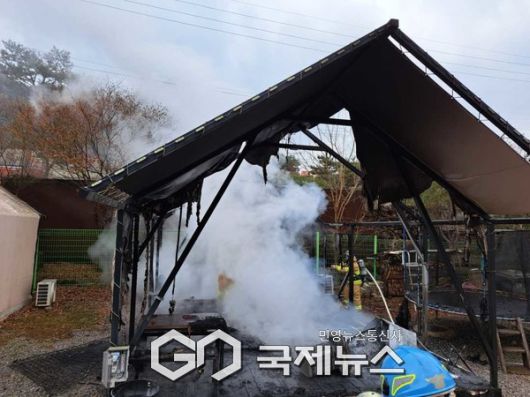 (홍천=국제뉴스) 최옥현 기자 = 12일 오후 2시 23분쯤부터 42분쯤까지 강원도 홍천 서면에 위치한 ○○○펜션의 글램핑장에서 화재가 발생해 텐트 한 동이 전소됐다.