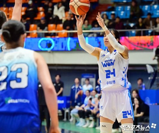 (엑스포츠뉴스 인천, 김한준 기자) 12일 오후 인천광역시 중구 도원체육관에서 열린 'BNK 금융 2025-2026 여자프로농구' 신한은행과 우리은행의 경기, 우리은행 이다연이 3점슛를 시도하고 있다.김한준 기자 kowel@xportsnews.com
